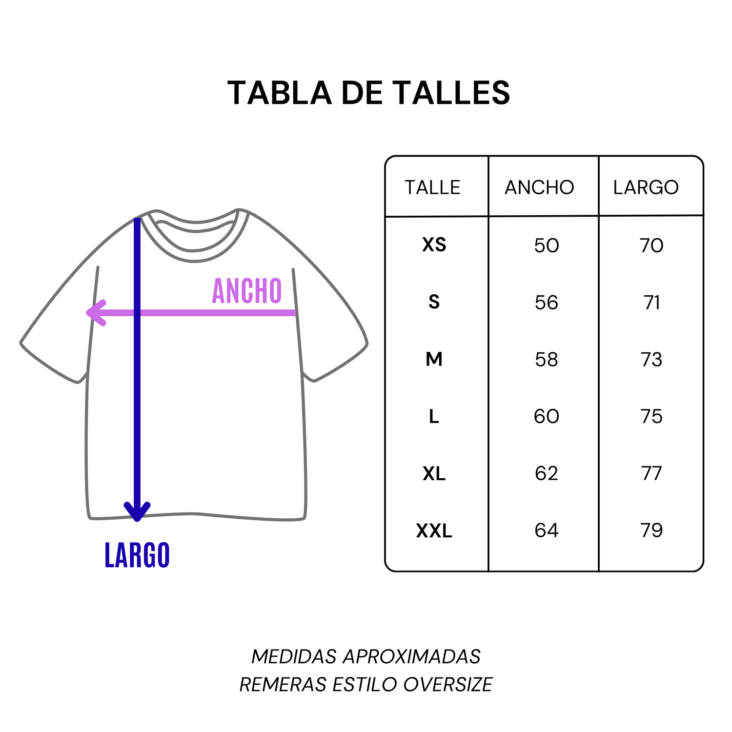 NO SE HACEN CAMBIOS O DEVOLUCIONES POR TALLE. Recomendamos revisar detalladamente la tabla de talles. Asegurate de medir una prenda tuya que te quede bien y compararla con nuestra tabla.
